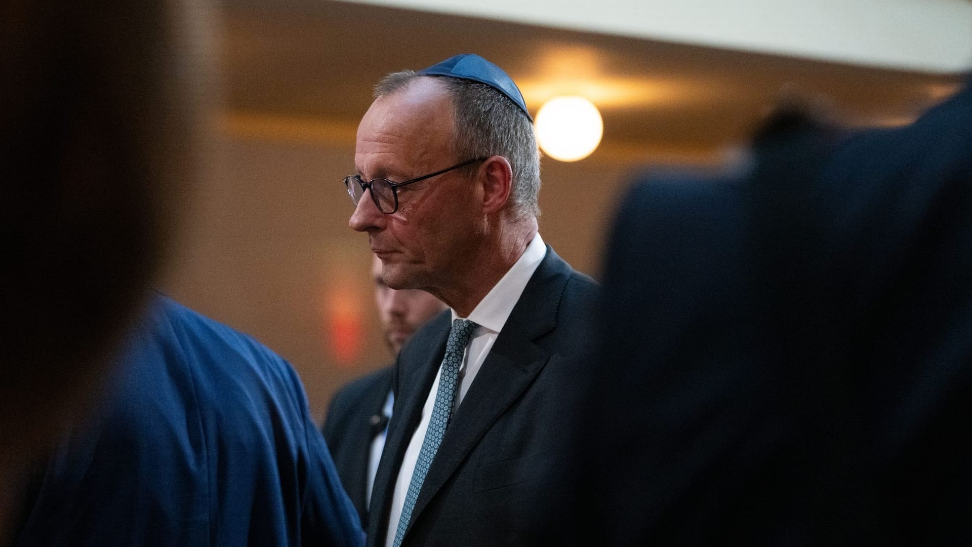 Was ist das für eine Ballon-Kippa? Erinnert an die Schabel-Masken. Ich habe mal einen Juden mit noch weniger Resthaar und schön flach sitzenden Kippa gefragt, wie er die denn befestige. Er hat sie abgenommen und mir ein filigrane Klammer gezeigt, die das Ganze hält. Ich würde mal vermuten, dass Merz nicht viel Übung darin hat. Für einen Kotau reicht es aber.